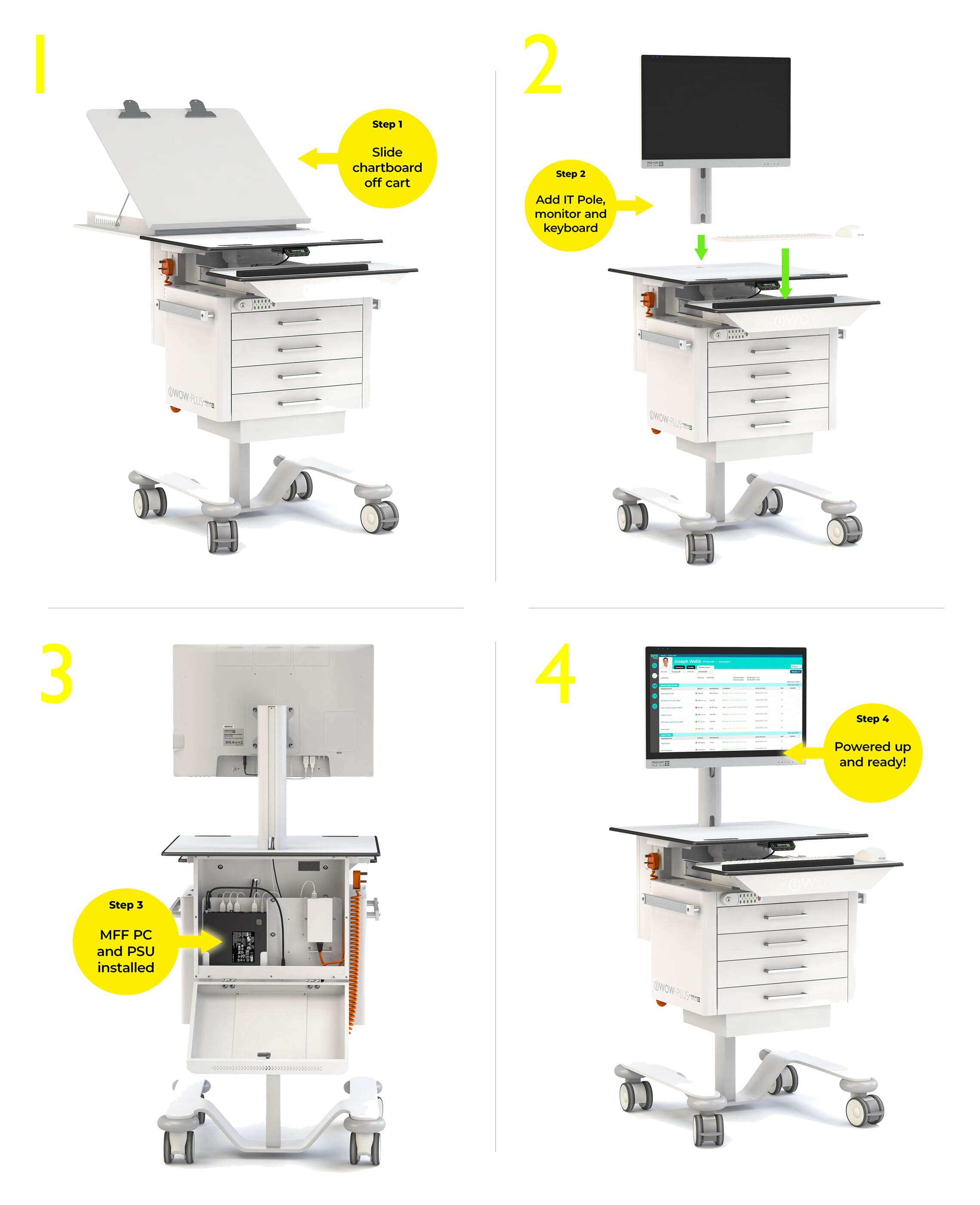 The unit can also be upgraded at any point, with the addition of an IT Pole, Monitor & Keyboard as well as installing a MFF PC, converting the unit to be a fully functioning mobile PC workstation as depicted below.