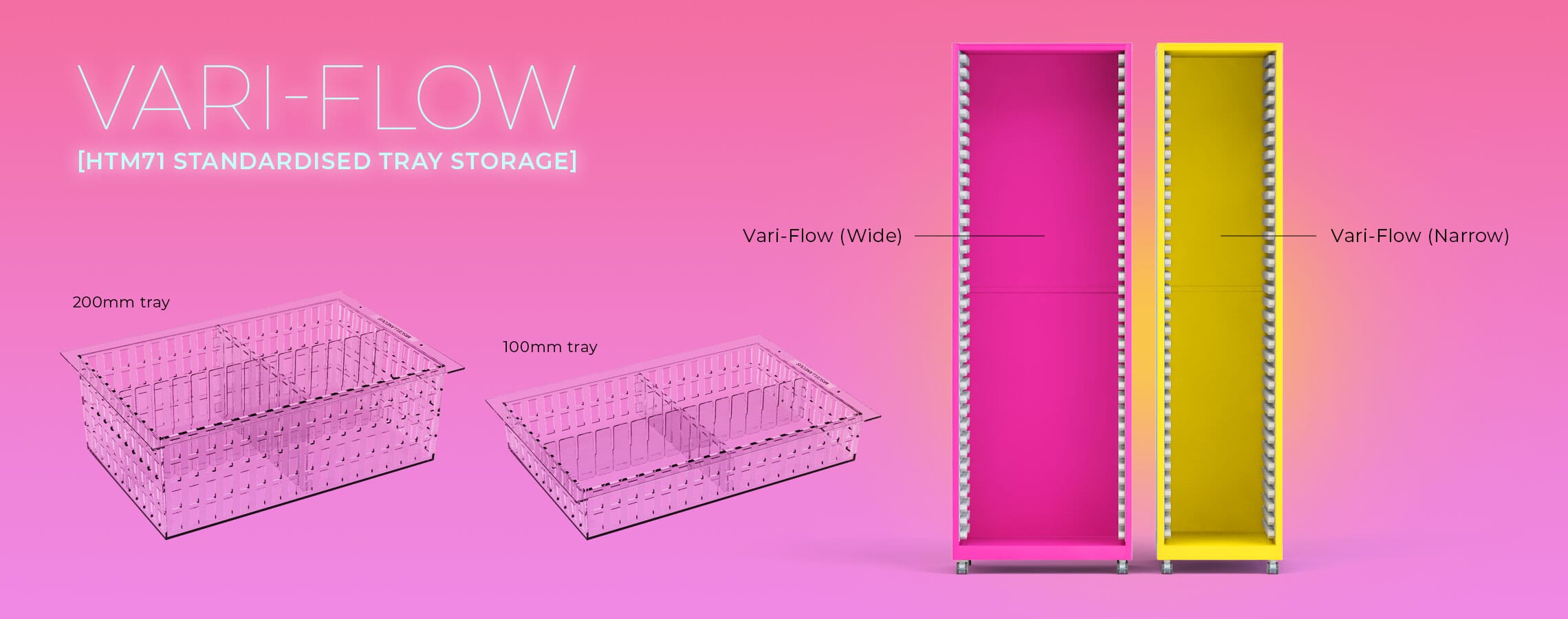 - NARROW DESIGN - The C is the narrow version of our Vari-Flow, at only 465mm wide it provides a high level of storage without occupying too much space in confined environments such as store rooms. In this configuration the HTM71 trays are mounted lengthways, accessing the tray on the shorter edge. Combine this system with a Vari-Lite cart also housing HTM71 trays, for a full transferable HTM71 solution.