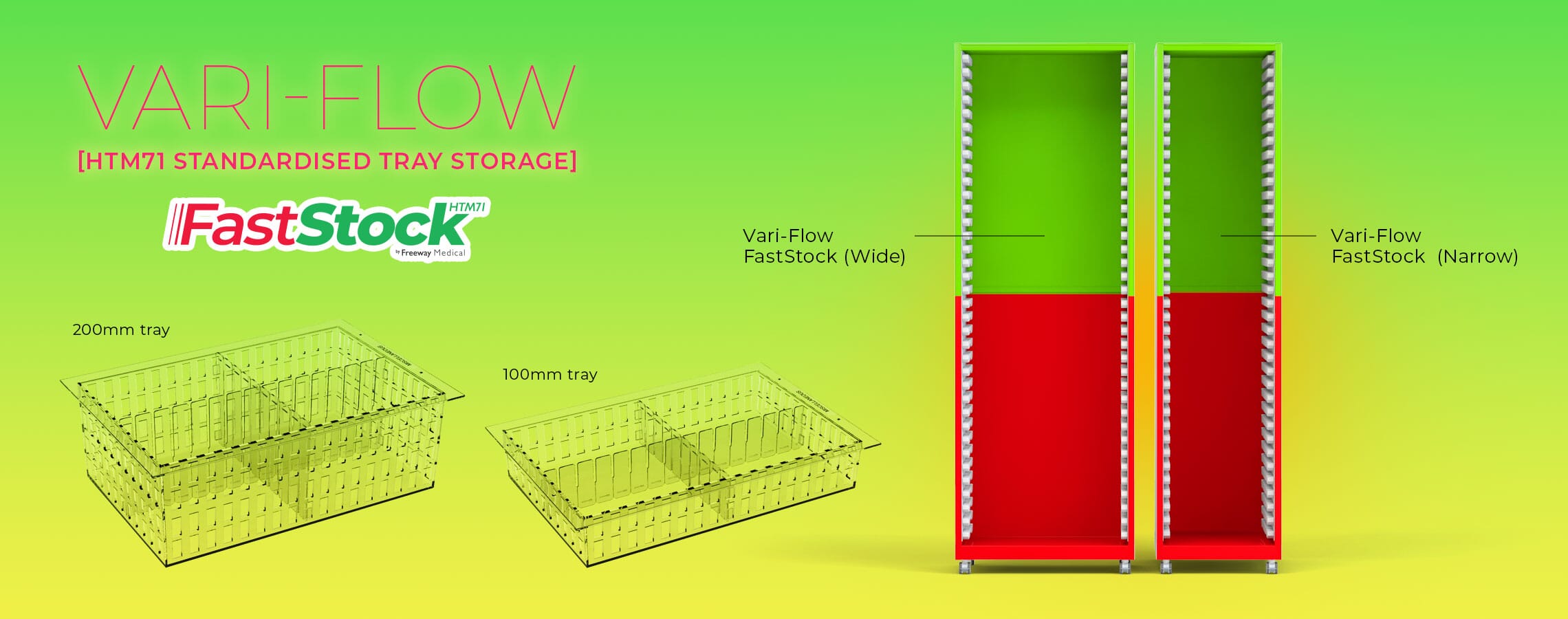 - FASTSTOCK BY FREEWAY - The FastStock is a unique version of our Vari-Flow, available in both widths but pre-configured with a green coloured top area to denote stocked trays and a red coloured bottom area to denote empty trays. The empty tray is removed from use / the cart and placed into the red area on the Vari-Flow, a new fully stocked tray is then pulled from the green area and returned to use / the cart, back-room staff then replenish the empty trays and return them to the green area for use. Using this system enables a member of staff to swap a used tray for new in seconds, eliminating the need to check and restock the tray there and then, increasing efficiency and decreasing the likelihood of errors. Combine this system with a Vari-Lite cart also housing HTM71 trays, for a full transferable HTM71 solution.
